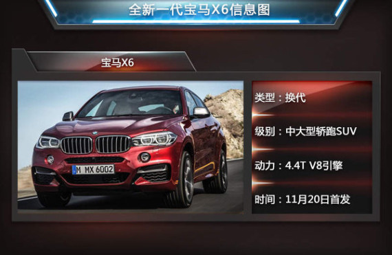 宝马X6从2008年上市以来取得超过25万台新车的全球销量,随着产品周期调整,而今将迎来全新一代宝马X6车型。新车基于OKL平台打造,大量采用热塑性塑料、铝和镁等材质使全新X6在强度上有所增加,然而重量却比现款车型降低50kg,经过优化的气动外形使新X6的风阻系数仅为0.34。