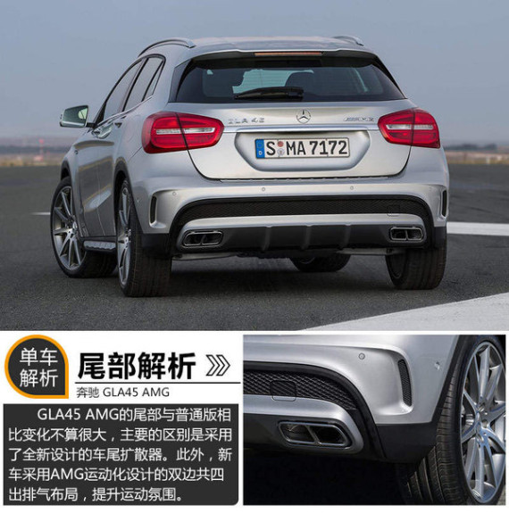 与普通版的GLA260车型相比,奔驰GLA45 AMG的尾部变化不算很大,两段的通风口得以保留,在提升外观运动气息的同时,起到散热作用。不同的是,新车采用了全新设计的车尾扩散器,在美观运动的同时,为行驶时产生的车底气流起到更大的疏导作用。此外,AMG运动化设计的双边共四出排气集成在扩散器两端,强烈提升运动氛围。