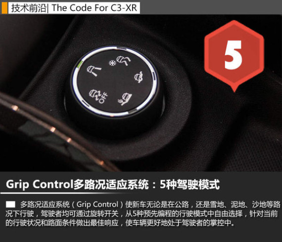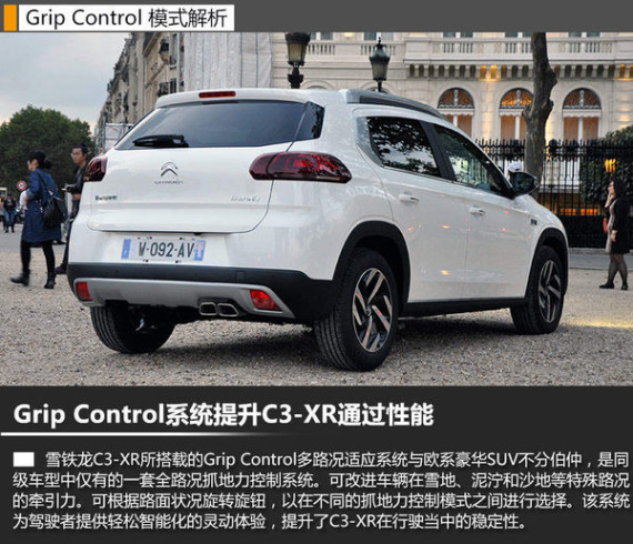由于平台原因,雪铁龙C3-XR并不支持四驱系统,Grip Control多路况适应系统弥补了作为两轮驱动的城市SUV车型在越野性能上的不足。对此,东风雪铁龙副总经理博纳文先生在接受采访时称:“Grip Control这样的智能多路况适应系统,就是可以根据不同道路的状况进行匹配,使驾驶员在应对复杂的路况时更加轻松自如。”例如,在中国的北方,冬天在雪地上行驶时,可以选择雪地模式,这个时候车辆的抓地力会得到增强,在沙地路面也是如此。他还说道:“我们在欧洲市场投放的一些车型,已经采用了Grip Control智能多路况适应系统,事实证明它是非常有效的。”