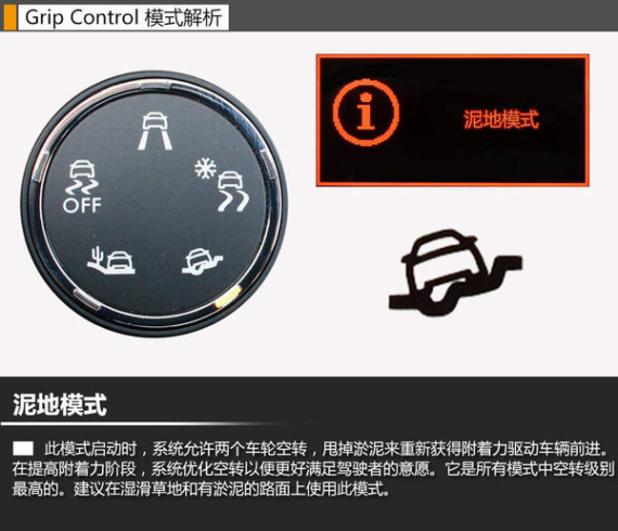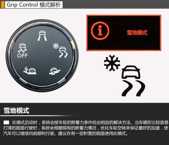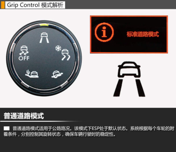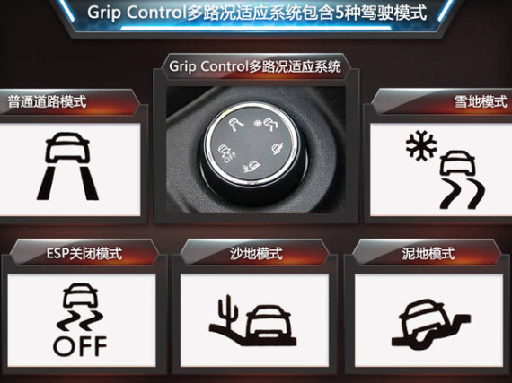 Grip Control多路况适应系统使新车无论是在公路,还是雪地、泥地、沙地等路况下行驶,驾驶者均可通过旋转开关,从5种预先编程的行驶模式中自由选择,针对当前的行驶状况和路面条件做出最佳响应,使车辆更好地处于驾驶者的掌控中。
