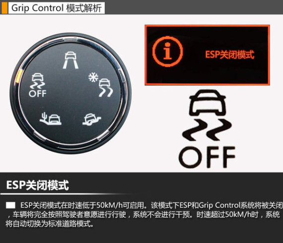 ESP关闭模式在时速低于50kM/h可启用。该模式下ESP和Grip Control系统将被关闭,车辆将完全按照驾驶者意愿进行行驶,系统不会进行干预。驾驶者为追求特技驾驶感受时也通常会采用此模式。时速超过50kM/h时,系统将自动切换为标准模式,以保证高速行驶的安全性。