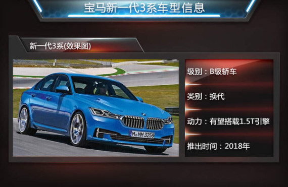 宝马3系定位于豪华B级轿车,换代车型预计将在2018年推出。外观方面是一大亮点,新一代3系的设计更为流畅、动感,其中前脸的变化尤其突出,家族式设计风格仍然保留,双肾型进气隔栅尺寸更大,采用镀铬条更有立体感,LED前大灯样式更为犀利。一体式下进气口线条十分简洁,雾灯处“T”字形装饰条同样抢眼。车身侧面仍有硬朗的长腰线,带来运动的效果。
