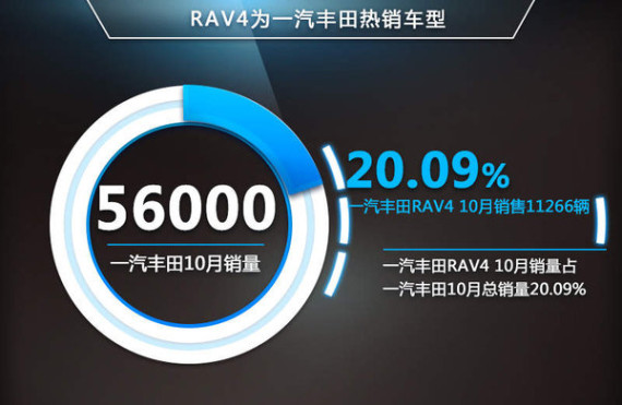 今年1-10月一汽丰田RAV4的累计销量达到了9.99万辆,其中10月份销售11266辆,占一汽丰田10月总销量的20.09%,成为仅次于卡罗拉的第二热销车型。此次RAV4改款车型的上市,或将在今年最后一个月为年底冲刺销量目标起到促进作用。