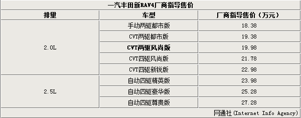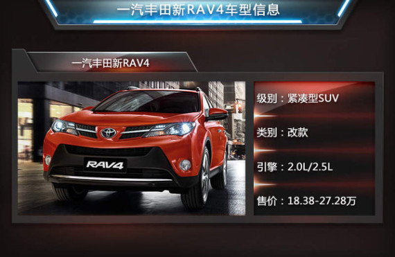 一汽丰田新款RAV4今日正式上市,新车除在配置上进行了小幅提升外,在不同款车型的外观与内饰上也进行了小改。网通社走访北京多家一汽丰田4S店获知:新款RAV4搭载与老款相同的2.0L及2.5L引擎,售价区间为18.38-27.28万元。另外新车2.0L CVT两驱车型新增一款风尚版车型,售价为19.98万元。