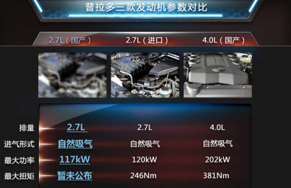普拉多车型是一汽丰田旗下唯一一款七座SUV,定位中大型SUV。目前进口版普拉多使用的2.7L自然吸气发动机,其最大功率120千瓦,最大扭矩246牛米。明年一汽丰田推出的新普拉多,搭载的 2.7L发动机最大功率为117千瓦,百公里油耗12.6升。