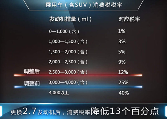 相对于国产的4.0L普拉多车型,搭载2.7L小排量的车型在售价也将有更大的优势。依照国内法律法规,现款普拉多在国内销售,其发动机排量为4.0L(3956mL),消费税率将按照25%收取,而在换搭2.7L(2694mL)发动机后,其消费税率将降至12%,税率差达到了13个百分点,车型售价大幅降低。目前国产4.0L普拉多的入门车型价格为53万,2.7L普拉多进口车型最低售价为45万,预计国产2.7L普拉多的入门售价在35万,这将在竞争中占有更大优势。