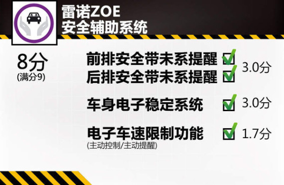在车辆的辅助安全技术评估环节中,车速限制、ESP车身稳定系统以及安全带未系提示都是其评估项目。雷诺ZOE的辅助安全配置较为齐全,以上安全辅助系统全部是标准配置,并且达到了测试要求,获得了8分的良好成绩。