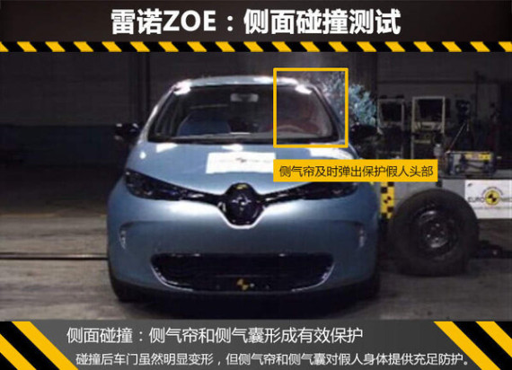 在正面碰撞测试中,大部分撞击能量被雷诺ZOE的发动机舱吸收,碰撞后A柱并无明显变形,驾驶舱保持了良好状态。安全气囊及时弹开,模拟驾驶员和乘客的头部均受到良好的保护;同时,驾驶员的胸部受到的防护也是足够的。假人数据读数显示出他们的膝盖和股骨也同样受到良好的防护,需要指出的是,对于身材不等和坐在不同位置的乘客,此车提供的保护水平都是一致的。