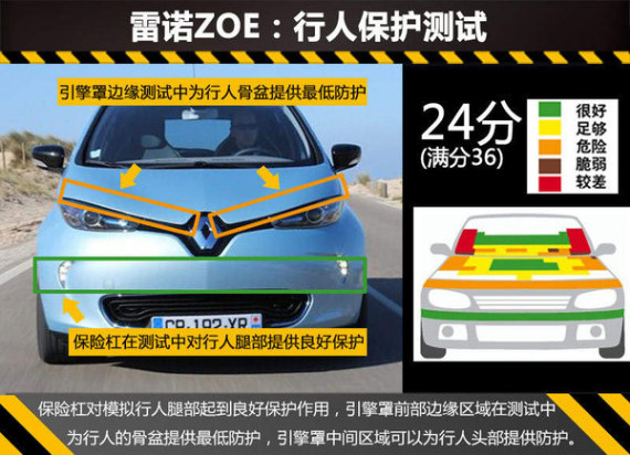 行人保护测试也是重要的一项评测环节,这项测试满分36分,雷诺ZOE拿到24分。此车的保险杠在测试中对行人腿部的保护比较到位,取得了6分满分;而发动机罩前端区域对行人骨盆只能起到最低的防护作用,但中间区域可以为行人头部提供一定的防护;此外,A柱下端区域对行人头部保护欠佳。