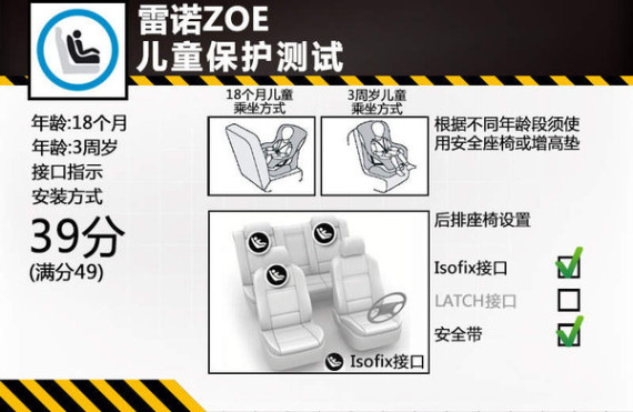 儿童安全保护测试中,雷诺ZOE车内18个月模拟儿童假人在正面碰撞和侧面碰撞中都能受到较为充分保护,3周岁模拟假人在各项测试中也能够被合理约束在儿童座椅内。在儿童座椅安全接口提示方面,此车在后排座椅提供了两个ISOFIX接口,在前排座椅上提供了一个ISOFIX接口,所处位置操作均较为方便,安装指示的各种标识也非常清晰。ZOE的副驾驶座位置安全气囊可以关闭,以便允许在座位上使用背向式儿童安全座椅,并且为驾驶员提供了清晰的使用方式信息以及警示信息。需要指出的是,测试车型的后排中央位置不能稳定安装Group II/III型安全座椅。儿童保护测试成绩满分为49分,雷诺ZOE得分为39分。