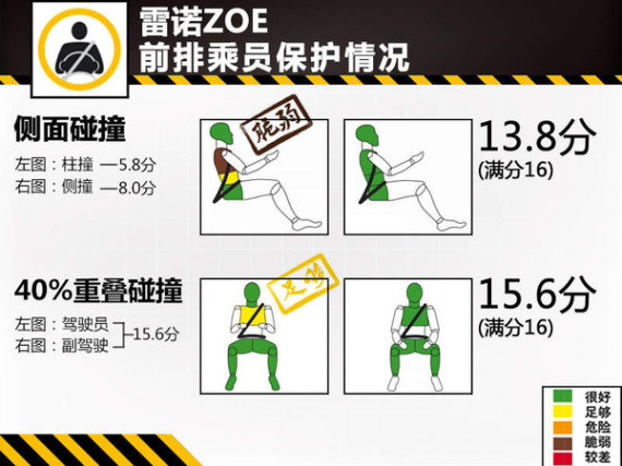 这次参加碰撞测试的车型是欧版雷诺ZOE,在E-NCAP发布的碰撞测试报告中,此车最终评定碰撞星级为5星,可以说这款小型纯电动车总体成绩优秀。但在成年乘员保护大项中,该车的侧面柱撞项成绩得分较低;而在相对温和的正面碰撞和侧面碰撞测试中,ZOE表现相对良好。此外,雷诺ZOE的儿童乘员保护项、行人安全项以及车辆辅助安全项,均取得了较为理想的成绩。(注:在欧洲参加测试车型的最终碰撞成绩仅供国内消费者参考)