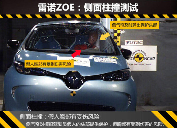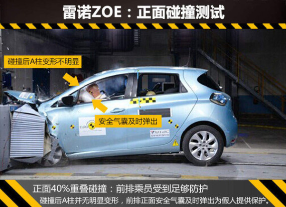 2014广州车展上,雷诺发布了小型纯电动汽车--ZOE。这款造型小巧可爱并充满现代感的新能源车型在动力上搭载了一台功率65kW、扭矩220Nm的电动机,最大续航里程可达210kM。雷诺早在2011年曾提出“2016-驾驭变革”战略,承诺将碳排放量减少10%,伴随中国新能源补贴政策的不断推出,ZOE未来有望以进口的方式进入国内市场。在安全方面,雷诺ZOE已在欧洲进行了碰撞测试,媒体发现此车在正面和侧面撞击中均能为车内乘员提供足够的防护,但在严苛的侧面柱撞测试中,车内模拟驾驶员假人的胸部有受伤风险。ZOE在侧撞测试中对车内乘员的保护还有待进一步提升。