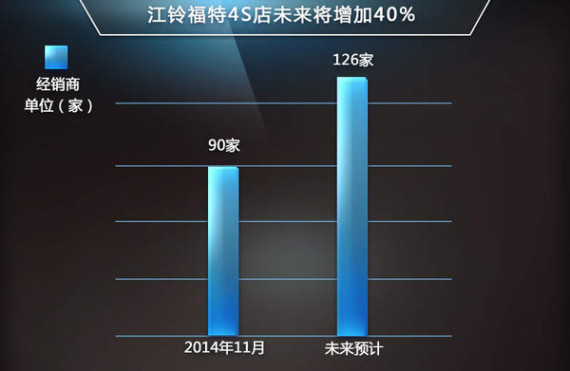目前江铃旗下的福特品牌经销商数量约为90家,主要负责销售的江铃福特全顺。2013年全顺系列在华销售6.78万辆,这个销量放在乘用车市场可能并不算大,但对于本身容量并不大的高端轻客市场已占到60%的市场份额。明年,福特撼路者将正式上市,江铃正计划扩大福特经销商渠道。新增40%家经销商后后江铃福特经销商数量预计将达到120多家。未来撼路者将于与全顺等商用车同网销售。
