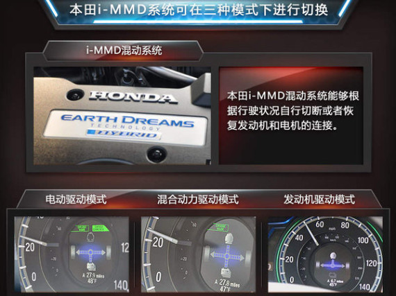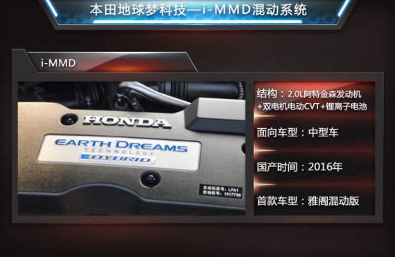 i-MMD系统全称为“SPORT HYBRID i-MMD”,是本田技研在去年中国媒体大会中,发布的“地球梦科技”系列动力总成之一。该系统由2.0L阿特金森循环汽油发动机和新开发的双电机电动CVT、以及锂离子电池组成,主要针对中型车进行研发。根据本田此前公布的规划内容,i-MMD系统将在2016年进行国产,首款搭载该系统车型即是雅阁。