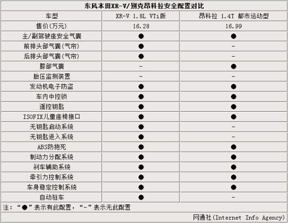 作为全新SUV车型,XR-V在安全性配置方面自然毫不含糊。除配备了主/副驾驶座安全气囊、ABS防抱死、制动力分配、刹车辅助系统以及发动机电子防盗等常规安全配置之外,还配有前/后排头部气囊(侧气帘)、自动驻车等5项昂科拉 1.4T 都市运动型所没有的配置,安全性可圈可点。