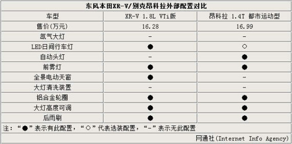 其次在配置方面,笔者将XR-V 1.8L VTi版与昂科拉1.4T都市运动型两款售价相近的车型进行了对比。两车在外部配置比较之下,XR-V略占优势,值得一提的是,XR-V全系标配全景天窗,遮阳板开口长度达到846mm,玻璃开口长度则达到475mm,能带来更加良好的通风效果以及更为宽阔的视野。