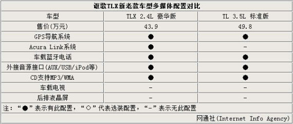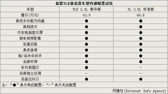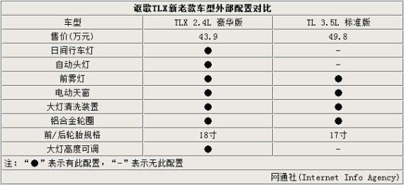 笔者将TLX 2.4L 豪华版与TL 3.5L 标准版两代车型进行了对比。经过比较后发现,TLX外部配置优势更为明显,日间行车灯、自动头灯以及大灯高度可调等功能,并且还配有18寸普利司通轮胎。在内部配置方面,TLX仅比TL多出了车内氛围灯一项。