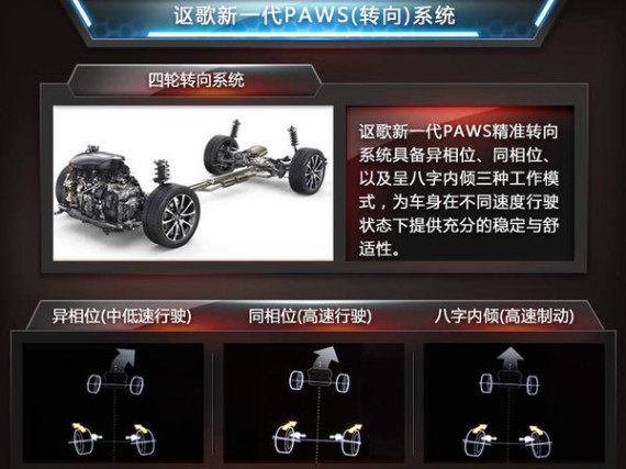 此外,TLX配备的新一代PAWS四轮精准转向技术,共分为异相位、同相位和呈八字内倾三种工作状态,其中异相位主要帮助车辆在60km/h中低速行驶过程中的保持相应的稳定性,而同相位适用于在90km/h以上的高速行驶状态,实现对后轮束角(后轮左右轮转向角)的独立与随意控制,以最小的转弯半径、稳定的操控,同时与AHA系统紧密配合,带来转弯精准性、良好的操控性能和车身稳定性。值得一提的是,TLX还在配置上进行了全面提升。