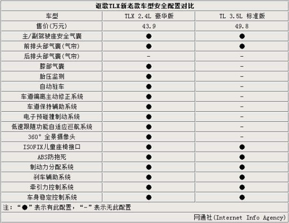 作为TL的换代车型,TLX在安全性配置方面增色不少。除配备了主/副驾驶座安全气囊、ABS防抱死、制动力分配、刹车辅助系统等常规主被动安全配置之外,还配有膝部气囊、自动驻车胎压监测以及车道偏离主动修正系统等8项TL标准版所不具备的配置,安全性可圈可点。