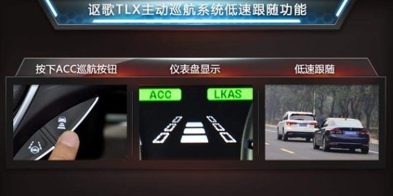TLX所搭载的ACC主动巡航系统添加了低速跟随功能,在设定好相应速度值与距离之后,前车从行驶停止三秒之内,后车会自动反应,与前车保持相应状态,如果前车出现偏移,TLX也能保持相应的安全跟随间距。