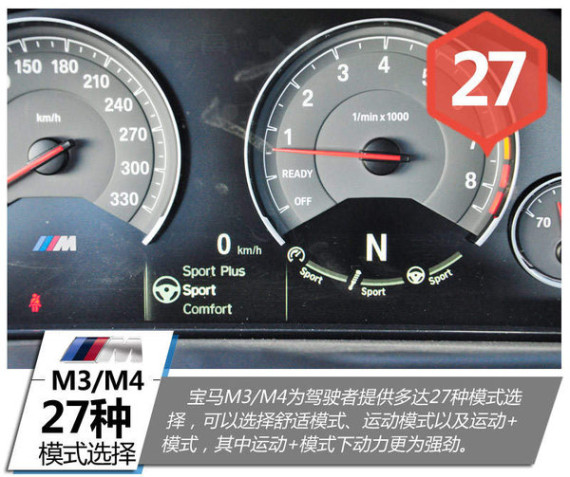 宝马M3/M4作为一款性能车,其方向盘、发动机、底盘均有三种模式选择,分为舒适、运动以及运动+模式,组合起来共有27种模式搭配。当你在城市道路行驶你可以选择舒适模式,既环保又舒适;当你想要激情时,你可以选择运动模式,体验不一样快感/推背感;当你下赛道,模式只有运动+可选,这时你的肾上腺素将激增,随着发动机的声浪一起挑战速度。