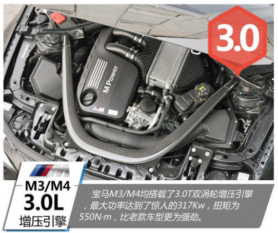 宝马M3/M4均搭载了3.0T双涡轮增压引擎,采用了诸多的先进技术,如涡轮电控阀门等,该款发动机最大功率达到了惊人的317kw,扭矩为550nm。相比老款车型的4.0L V8引擎,最大功率高出8kw,扭矩相差150nm。其红线达到了7600转,当转速超过3000转时,发动机将爆发出强有力的排气声,同时也赋予了M3/M4较强的加速推背感。