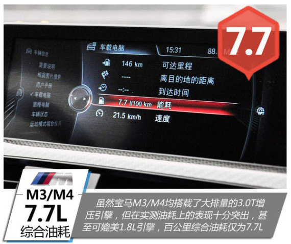 虽然宝马M3/M4采用了3.0T引擎,但在高速路况下的表现极其出色,百公里油耗仅为7.7L,可媲美任何一款1.8L以及1.5L引擎。对此,宝马负责研发发动机的的Robert Volkl表示:老款M3的百公里综合油耗13L左右,新款发动机在老款车型的基础上可机油20%以上,综合油耗仅为10L左右,把动力调校强劲的同时燃油经济性也更加出色。