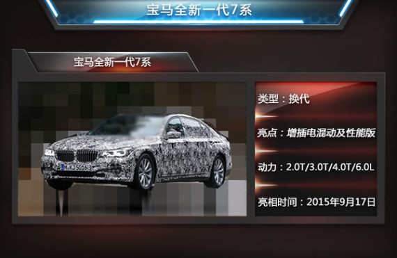 在奔驰新一代S级的迅猛攻势下,宝马加快了新一代7系的推出速度,据欧洲汽车媒体报道,新一代7系将在2015年9月17召开的法兰克福车展上正式发布,10月在欧洲市场进行销售。新7系将大量采用碳纤维材料,发动机盖、车顶以及后尾箱盖这些部位都有可能会采用碳纤维材料打造。宝马CEO雷瑟夫Norbert Reithofer表示:“全新一代7系车型也将使用碳纤维材料。它的轻质化将为同级车型树立一个新的更高的标准。”新7系在变速器方面将从8速升级为9速,该变速器将由德国零部件供应商ZF提供。虽然路虎的极光和Jeep的自由光已经率先搭载9速变速器,但在大型车上使用9速变速器宝马将是第一个厂家。