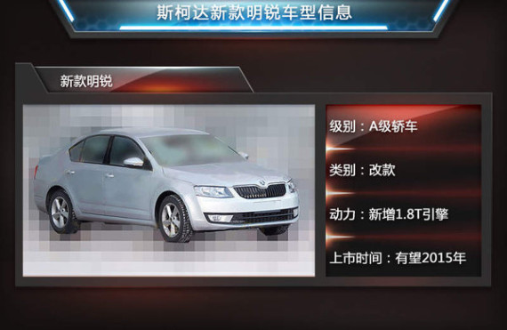 明锐 (配置|询价)作为斯柯达旗下主力车型之一,在今年5月刚刚完成产品更新换代,在外观、内饰以及动力上都经过了全新升级。近日媒体了解到:全新明锐将于2015年推出年度小改款车型,新车将延续现款车型的设计,格栅等细节处进行小幅度改动。动力方面则有望搭载大众最新EA888系列1.8T引擎,动力性能将有所提升。另外值得一提的是,在新款明锐并未采用大众此前宣布的“扭矩+发动机技术”命名方式,而是直接更换为“TSI”的尾部标识。