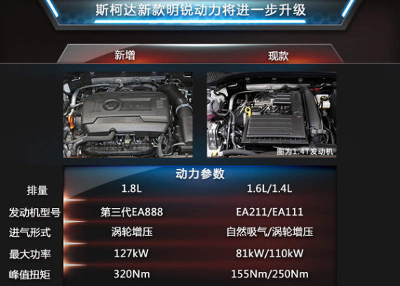 EA888是大众主推的发动机,以其充沛的动力以及出色的燃油经济性赢得消费者的青睐,此次新款明锐将搭载第三代EA888系列1.8T引擎,可见斯柯达对于产品的要求是跟随消费者的需求同步提升。这款全新1.8T发动机的最大输出功率为127kW,最大扭矩为320Nm。而现款明锐提供了1.6L和1.4T两款排量的发动机,新车将为消费者带来更加丰富的动力选择。