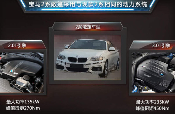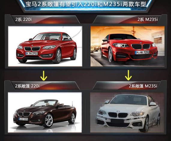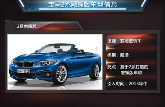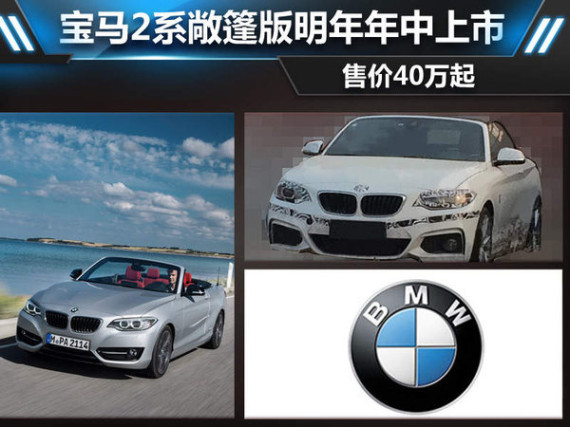 宝马品牌在2014年巴黎车展上发布了全新的2系敞篷车型,基于2系打造,采用软顶敞篷设计。新车与现款2系采用相同的动力系统,包括220i敞篷版和M235i敞篷版两款车型,未来也有望同步引入国内销售。近日媒体走访多家宝马4s店后获悉:宝马2系敞篷版预计将在2015年年中在国内正式上市,售价在40万元左右。