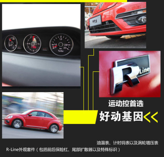 作为一名20岁出头的“90后”,对于速度的追求以及拉风的外观无疑成为了购车的首选。因此好动基因所拥有的R-Line外观套件满足了我对于外观的需求,大尺寸的进气口以及尾部扩散器,让本就动感十足的甲壳虫更为激进,同时车身多处R-Line的特殊标识清晰展现了其特殊身份。另外位于中控台上方的油温表、计时码表以及涡轮增压表使其内外充斥着运动基因。