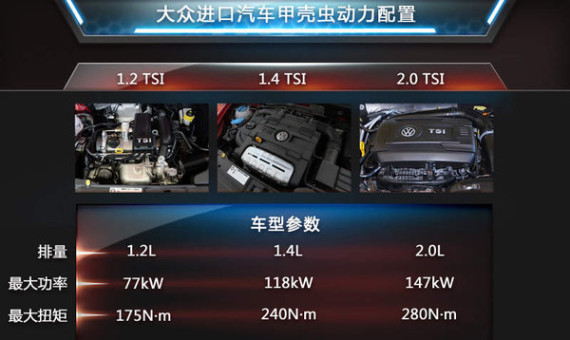 甲壳虫针对八大基因定制服务,推出了三款搭载不同动力配置的产品,分别为1.2 TSI、1.4 TSI以及2.0 TSI。而在动力参数上,排量最小的1.2 TSI涡轮增压发动机,最大功率77kW,最大扭矩175N·m。而1.4 TSI和2.0 TSI的最大功率则分别达到了118kW和147kW,峰值扭矩则为240N·m以及280N·m,为这款个性十足的精品小车带来了充足的动力储备。