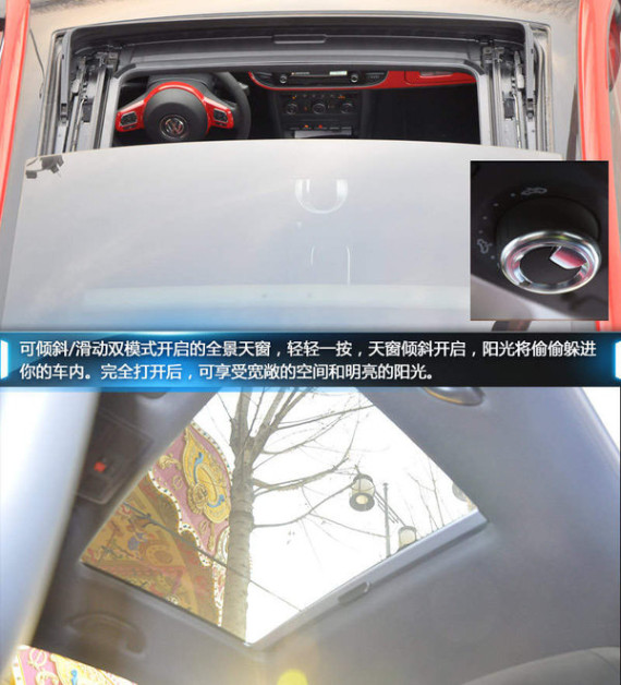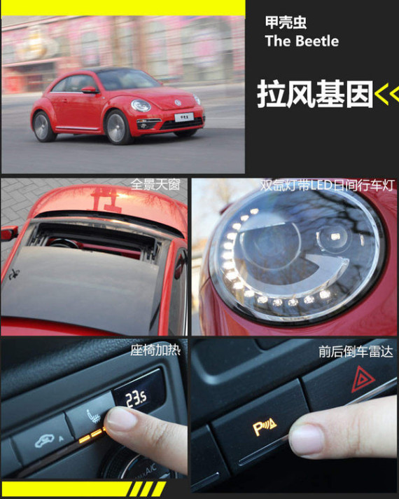与此同时“拉风基因”这个特殊的名词,自然也成为了首选。该项基因带有15颗LED光源的氙气头灯让甲壳虫的“眼睛”更为有神。另外可倾斜/滑动双模式开启的全景天窗、通过位于车顶上的控制旋钮便可对其进行轻松操控。另外座椅加热以及前后倒车雷达也在该项基因的名单中,在日常行驶中有较高的实用性。