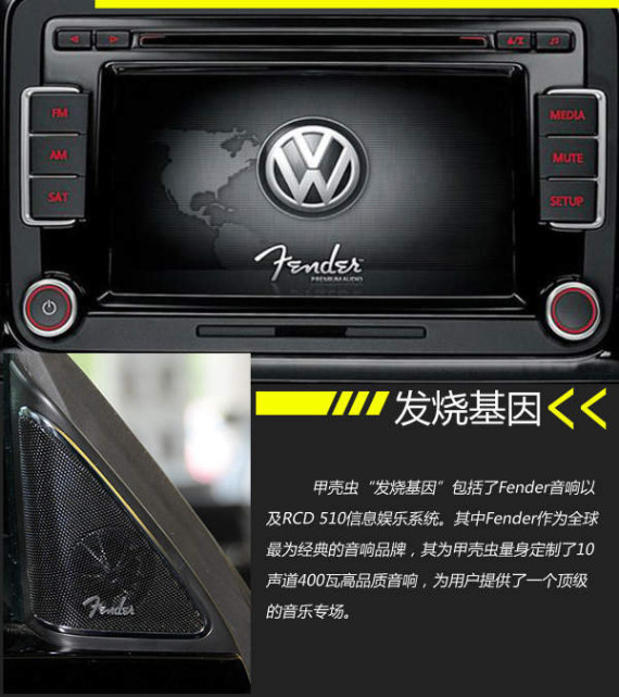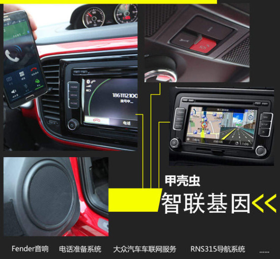 甲壳虫的智联基因中配有6.5英寸彩色触摸屏,并支持RNS315车载导航娱乐系统;大众汽车车联网服务能够记录车主设置的兴趣点,一键发送到车载导航系统中,直接设为目的地;电话准备系统通过蓝牙将车辆与手机相连,可同步接听电话。此外还配有高品质的Fender音响系统,为车主提供更好地驾乘享受。