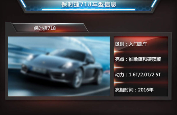 新命名方式预计将在下一代保时捷Cayman和Boxster车型上正式应用,届时,两款产品推出后有望分别命名为保时捷718和718 敞篷版。据了解新车型最快将于2016年正式发布,并且除采用全新的命名方式外,其在外观上也将相比现款车型更具动感。
