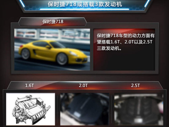 在动力方面,未来718有望采用1.6T、2.0T和2.5T三款涡轮增压发动机,最大功率将分别为156kW,213kW以及268kW,相比现款搭载2.7L和3.4L两款自然吸气引擎的产品而言,除入门1.6T引擎外,其余两款增压发动机在动力参数上,均有大幅度提升。另外排量较小的1.6T引擎虽动力略低,但其或将拥有更为出色的燃油经济性。