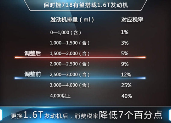 目前保时捷现款Boxster入门车型在国内的厂商指导价为72.6万元,未来全新产品得益于新1.6T小排量增压引擎应用,售价则有望进一步下探。根据国内消费税征收方案规定,全新1.6T排量所需缴纳的消费税率相比现款2.7L发动机而言,下降了7个百分点,因此售价有望同步下调五万元左右。