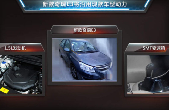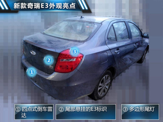 日前,媒体获得了一组关于E3的无伪谍照,该车的外观基本保持了现款车型的设计风格,只是在部分细节处进行了再加工。动力方面,新款奇瑞E3将会使用目前车型上“1.5L+5MT”的动力组合,上市时间则定在了2015年内。