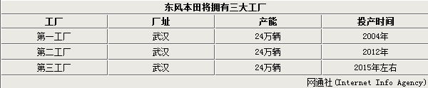 2004年东风本田在武汉建立第一工厂,其年产能为24万辆,目前主要生产车型包括CR-V、思铂睿、艾力绅及思域车型。时隔八年后第二工厂在武汉投产,主要生产新上市的XR-V、思域、杰德及思铭车型,届时东风本田拥有48万辆的年产能。随着未来具有24万产能的第三工厂建成,东风本田将打造72万辆的产能规模。