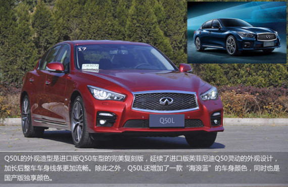 Q50L的外观造型是进口版Q50车型的完美复刻版,延续了进口版英菲尼迪Q50灵动的外观设计,加长后整车车身线条更加流畅。Q50产于日本栎木工厂,而Q50L则产于英菲尼迪全球标准的湖北襄阳工厂,其尾部的“东风英菲尼迪”以及“Q50L”标识彰显了国产和加长的特征。新加入的侧裙铝合金饰条点缀了整车的运动范。除此之外,Q50L还增加了一款“海浪蓝”的车身颜色,同时也是国产版独享颜色。在外观上种种迹象显示,英菲尼迪在努力让这一日系豪华品牌变得更为亲民。