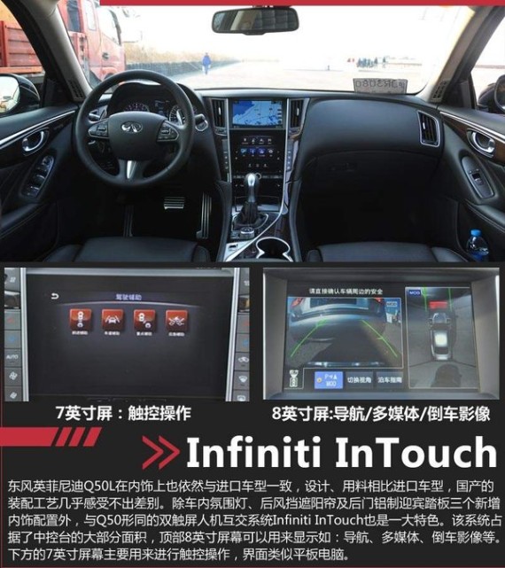 东风英菲尼迪Q50L在内饰上也依然与进口车型一致,设计、用料相比进口车型,国产的装配工艺几乎感受不出差别。同样的智能双触屏人机互交系统Infiniti InTouch占据了中控台的大部分面积,顶部8英寸屏幕可以用来显示如:导航、多媒体、倒车影像等。下方的7英寸屏幕主要用来进行触控操作,界面类似平板电脑。双温区自动空调功能被分开在屏幕两边,操作直接,且视觉条理清晰。车内氛围灯系统及后迎宾踏板的加入也提升了整车的豪华感,后风挡电动遮阳帘的设计也十分实用。坐在Q50L车内或许会让你产生驾驶轿跑车的错觉,即便是宝马3系最坚定支持者,也无法否认该车修长的侧面轮廓具有更令人赏心悦目的运动格调。