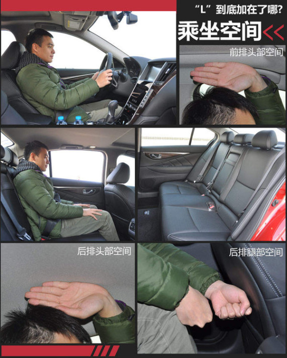 Q50L的长宽高分别达到4840/1823/1456mm,相比进口版Q50长度增加了50mm,高度增加6mm,轴距更是加长了48mm达2898mm。得益于接近2.9米的超长轴距,该车型拥有了更为宽敞的后排乘坐空间,Q50L的后排座椅也因此加长了不少。尤其最大限度的拓展了后排腿部空间,弥补了Q50腿部空间不太够的缺陷。以175cm身高的体验者为例,将Q50L的前排座椅调整到最佳的坐姿时候,头部空间一掌有余,腿部的空间富裕。