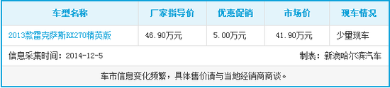 新浪哈尔滨汽车讯 近日,编辑从哈尔滨龙晟雷克萨斯4S店了解到,雷克萨斯RX (配置|询价)优惠5万元,店内少量现车销售,感兴趣的朋友不妨到店赏车试驾。购车咨询进入经销商微博:哈尔滨龙晟LEXUS雷克萨斯 详情请见下表: