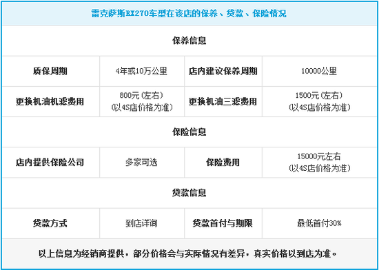 车型简介:全新的RX270在造型上,同雷克萨斯RX350基本没有区别,不论是外观还是内饰都保持了RX车型的原样。只不过在轮圈的样式上,换成了更廉价的配置。而和RX450H相比,RX270还是保持着同样的差异,比如混动车型说特有的蓝色雷克萨斯LOGO,可选装的LED灯、蓝色的头尾灯以及不同样式的前保险杠和水箱罩隔栅。不过不管如何不同,RX270的家族面孔还是能很明显被认出来。外观上没什么改动,RX270的变化自然是来自动力上。从它的命名上,我们可以了解到这款车型是装配的一款更小排量的2.7L引擎。而从RX270和丰田汉兰达共平台的情况来看,这款2.7L引擎基本上就如同国产2.7L汉兰达一样,采用的丰田IAR-FE直四引擎,这部引擎有着最大187马力的功率输出,和252牛米的峰值扭矩。总体动力的感觉,应该就和2.7L版汉兰达一样,只不过RX要显得更豪华。