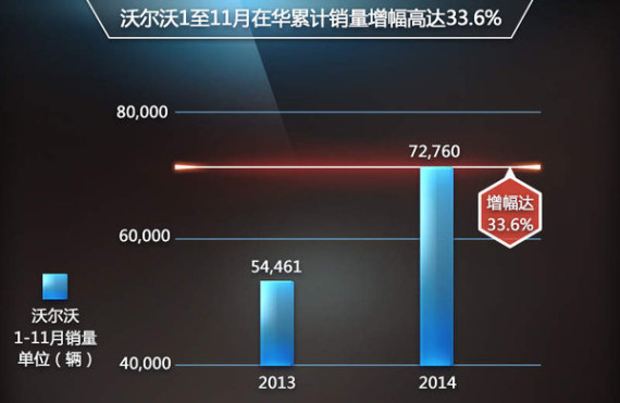 最新的数据表明:沃尔沃汽车前11个月的在华累计销量为72,760辆,与2013年的54,461辆相比,实现了33.6%的增长。到2014年11月为止,沃尔沃汽车全球已连续保持17个月销量持续增长,其中中国市场对全球销量的增长起到了举足轻重的作用。在11月初所公布的销量数据当中,沃尔沃前10个月的在华累计销量就已经超过了2013年全年的在华销量,以目前沃尔沃的销售形势来看,预计今年销量将突破8万辆,总体销量增长突破30%。在S60L混动版、V60 Cross Country以及全新一代XC90三款全新车型的助推下,沃尔沃2015年的在华总体销量突破10万辆大关将成为可能。