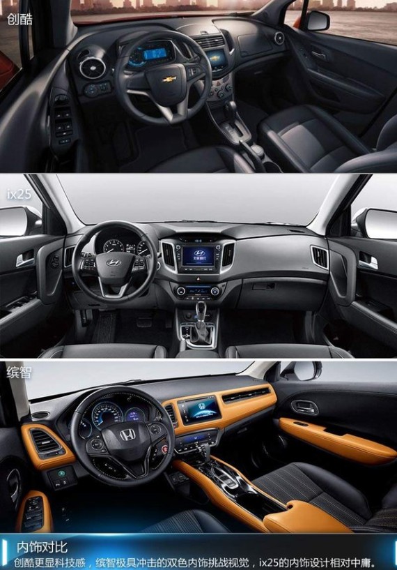 内饰方面雪佛兰创酷秉承简洁的风格,蓝色的仪表盘很有科技范,环抱式的驾驶座舱让人坐进车内就非常有驾驶欲望。与创酷科技范不同,缤智内饰延续了外观时尚的风格,橙色和黑色的大胆碰撞抓人眼球,这能吸引部分个性人群。但显然不是所有人都敢挑战这一配色。相对创酷和缤智,ix25的内饰显得中规中矩。