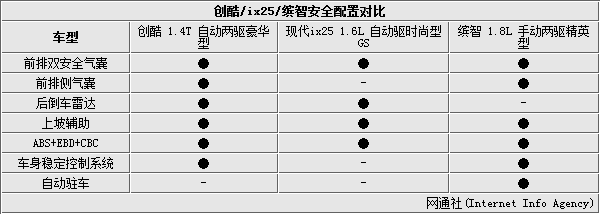本次对比的3款车都是今年上市的小型SUV。为了保证比赛的公平性,我们选取的三款车型均在13—14万之间,创酷 1.4T 自动两驱豪华型厂商指导价位14.39万,目前4S店优惠后售价在13.69万左右;北京现代ix251.6L 自动两驱时尚型GS售价为13.38万元;而缤智1.8L 手动两驱精英型为13.88万元。3款车型价格差距控制在0.5万元左右。