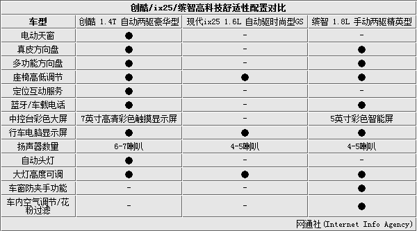同为13万左右车,三款车在科技舒适性配置上相差却非常大。毫无疑问ix25相比另外两款车型在配置比拼中再次落后。舒适配置方面,创酷拥有真皮座方向盘、电动车窗,与缤智相比少了车窗防夹和车内空气调节功能。娱乐配科技置方面,创酷的7寸触摸屏显然比缤智5寸的更加大气,配备6-7喇叭的扬声器大音效上也更胜一筹,此外创酷还拥有其他两款车型所没有的自动头灯。总体来看,创酷和缤智配置上各有优劣,缤智偏向高端范,而创酷则走的是实用主义路线。