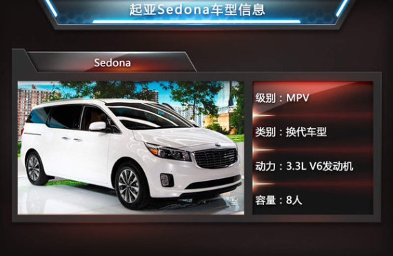 唯一的一款MPV新车Sedona则是VQ的换代车型,新车拥有全新的前脸设计。据官方消息了解到,车内座椅灵活多变,并最多可以容纳8人。动力方面,新车将搭载3.3L V6发动机,最大功率为203kW,峰值扭矩为336Nm。传动方面,匹配6速自动变速箱。